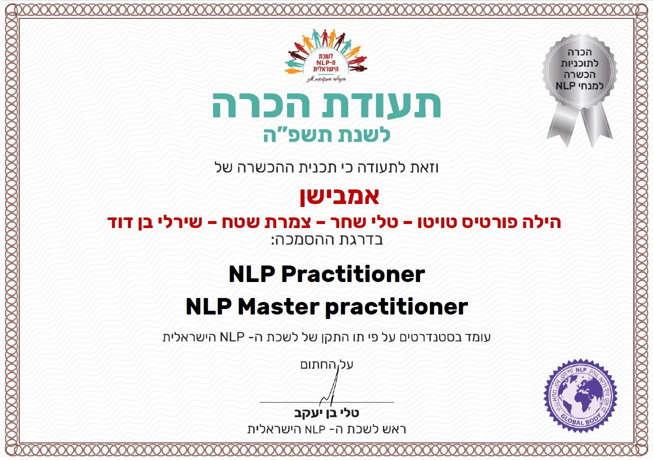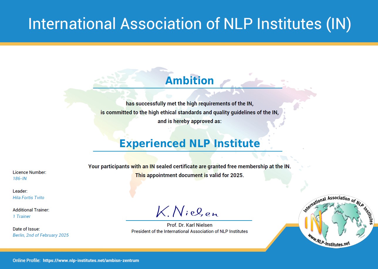 מי שמחפשת תכנית לימודים מוכרת ומפוקחת על ידי האיגודים המקצועיים ביותר בארץ ובעולם בתחום ה-NLP (לשכת ה-NLP הישראלית והאיגוד הבינ"ל - IN NLP)
